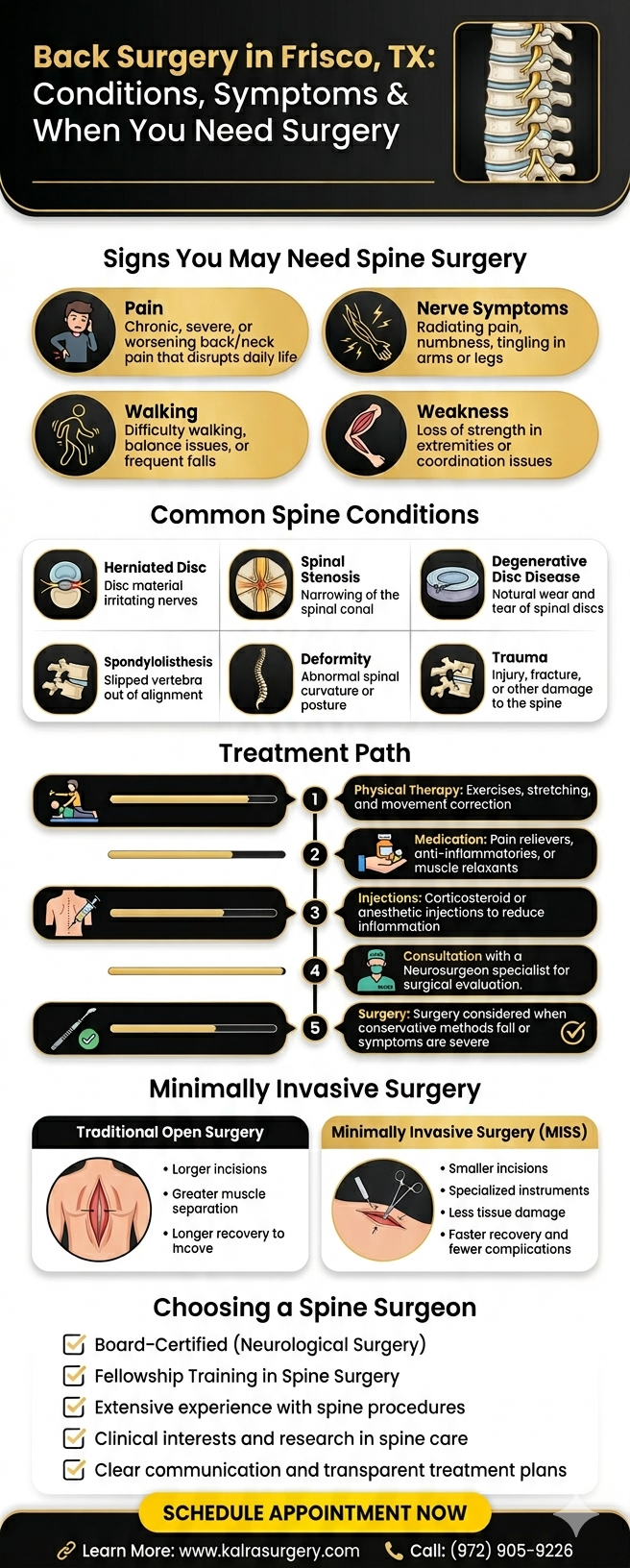 Back surgery is not about rushing into an operation, it’s about finding the right surgeon, with the right solution, at the right time. Many patients in Frisco, Texas benefit from surgical care only after thoughtful evaluation and failed conservative treatment.